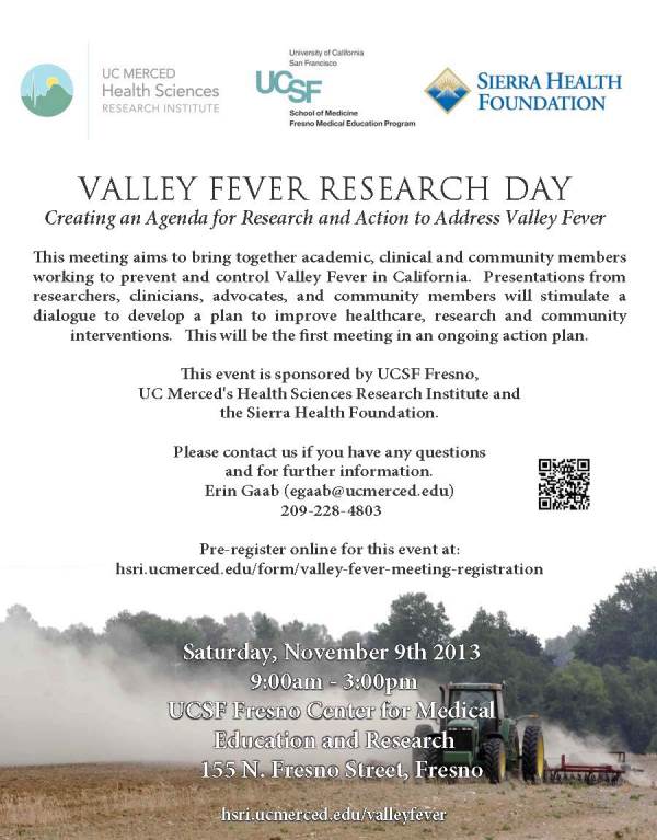 Please join us for the Health Sciences Research Institute's Research Day on Valley Fever, “Creating an Agenda for Research and Action to Address Valley Fever” at 9:00am on Saturday, November 9th at UCSF Fresno Center for Medical Education and Research.